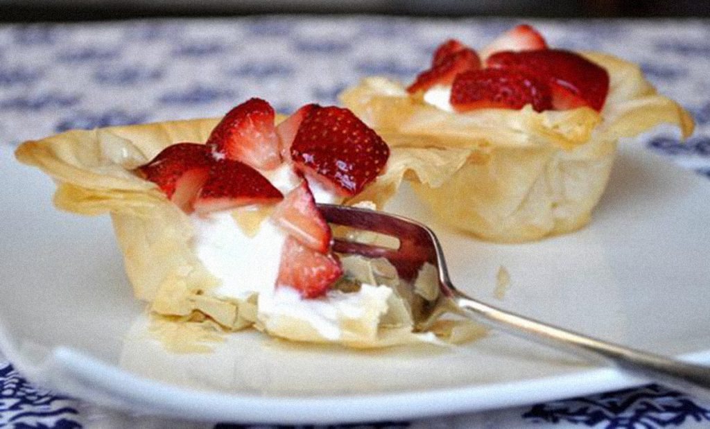 Cortar la vaina en el largo y sacar las pepas con la punta de un cuchillo. Batir la crema fresca con el azúcar granulada y la vainilla, y dejar en la nevera. Mezclar el resto de azúcar con la canela. Desenrollar las hojas de masa filo Saint Jacques. Cepillar mantequilla derretida en las 4 hojas de masa filo, y espolvorear azúcar con canela en 3 hojas (dejando una hoja con mantequilla no más). Cortar cada hoja en 4 cuadrados del mismo porte. En cada molde individual para tartaleta, superponer “desordenadamente” 3 cuadrados de masa filo con azúcar y un cuadrado con solo mantequilla al final. Poner al horno unos 6-8 minutos, hasta que la masa filo quede dorada. Sacar del horno y dejar que se enfríen las copelas por completo.