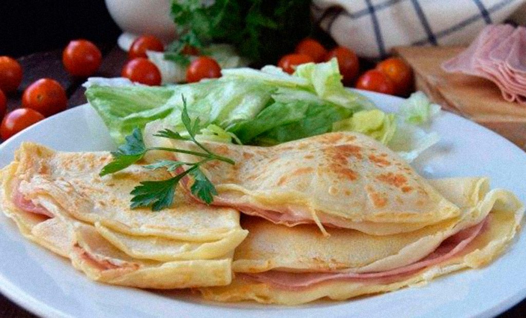Caliente las crêpes en microondas durante 10 segundos. Enrolle con una lámina de jamón. Sirva acompañado de una ensalada de lechuga sazonada con la vinagreta francesa.