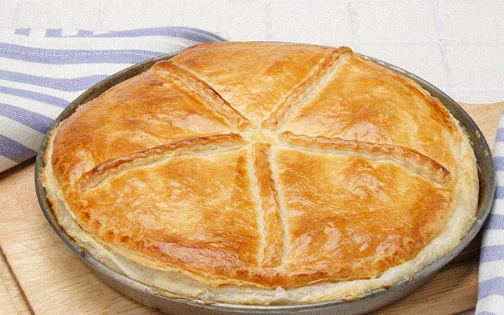 Parta el pollo en trozos y dórelo. En la picadora mezcle el ajo y la cebolla junto con el ketchup y el pimentón. Caliente el aceite que dejó el pollo en una olla y agregue la mezcla triturada revolviendo. Incorpore el tomate, la salsa inglesa, la pimienta y la sal. Dele un hervor. Agregue los trozos de pollo y el jerez, tape y cocine a fuego lento, hasta que el pollo esté blando. Si es necesario coloque un poco de agua. Apague el fuego y retire. Deje enfriar y luego desmenuce el pollo. Coloque nuevamente el pollo en la olla y añada las alcaparras, las aceitunas y las pasas, dándole un hervor hasta que la preparación logre una consistencia espesa. Deje enfriar. Mientras forre el molde engrasado con una lámina de hojaldre Saint Jacques, rellene con el guiso de pollo y extienda la otra lámina encima tapando el molde. Una los bordes apretando con los dedos y pincele con huevo. Lleve al horno hasta que la masa esté dorada.