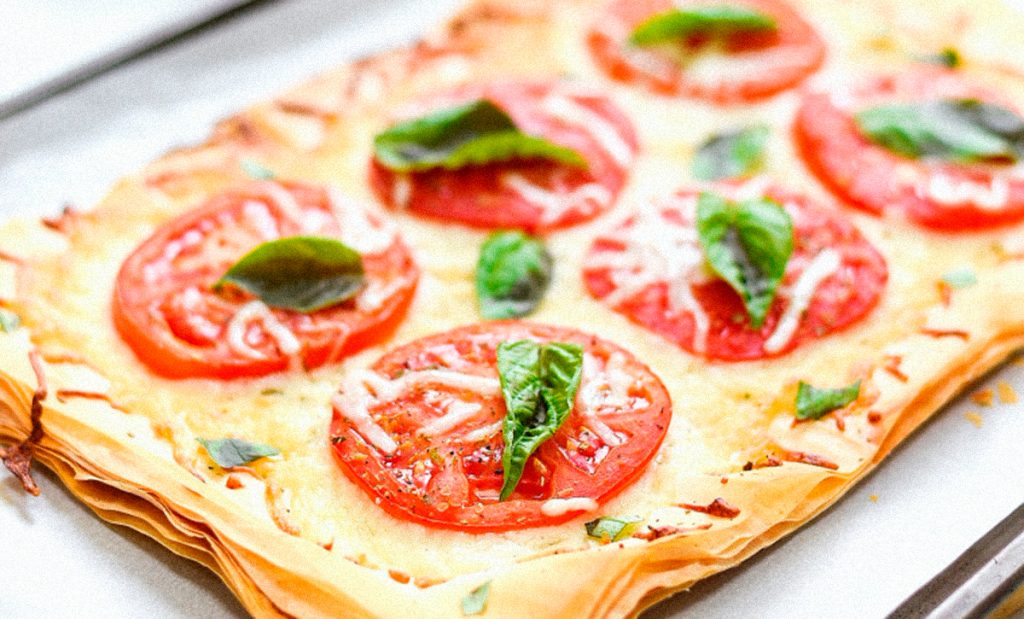 Poner a calentar el horno a 220° (Th 7). Escurrir los champiñones. Cepillar con mantequilla derretida la placa rectangular del horno (o una hoja de aluminio puesta en la placa). Poner en la placa la primera hoja de masa filo Saint Jacques, y cepillarla con mantequilla derretida. Repetir la operación con las 2 hojas de masa filo siguientes. Superponer la cuarta hoja pero dejarla sin mantequilla. Doblar los bordes de las hojas de masa filo hacia dentro si se salen de la placa del horno. Cubrir la superficie con queso granulado (o mozzarella en rodajas o granulada). Esparcir la carne molida, los champiñones y las rodajas de tomate. Espolvorear un poco de sal y de pimienta, de cebolla en polvo y de orégano. Cocinar en el horno por unos 15 minutos, sacar la pizza cuando los bordes hayan quedado dorados.